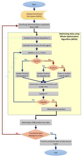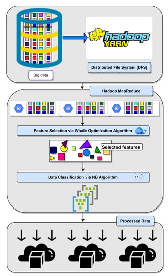 The processing in this phase means optimizing data by using a hybrid algorithm. This algorithm performs a feature selection on big data that is stored in the HDFS using WOA, then classifies this optimized data using NB, and this processing is accomplished by MapReduce programming and parallel computing, as shown in Figure 6.