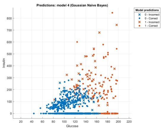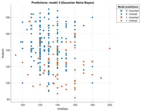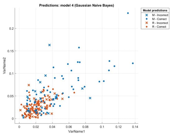 This section presents the results that were achieved from testing the hybrid WOA-NB algorithm. First, we will introduce a comparison between the accuracy and speed of processing for every tested dataset using two ways. The first one is by executing classification only by using NB. The second one is by executing feature selection then classification by using WOA then NB, and this is the hybrid algorithm mentioned previously. The first-way results are introduced in Liangxiao et al. [], which give NB results without other algorithms on multiple datasets. The second-way results will be calculated after executing the proposed hybrid algorithm. The comparison results will be shown in Table 3. Figure 8, Figure 9, Figure 10 and Figure 11 depict the original and predicted data shapes for different datasets.