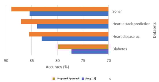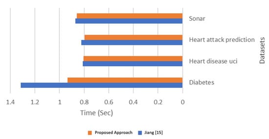 The results show an enhancement in accuracy and time using the proposed approach over classification with only NB []. The enhancement is based on the number of reduced features after applying the WOA feature selection technique. In the Diabetes dataset, there are four of eight fewer features, and this enhanced the accuracy by 3.34% and reduced the computational time by 28.96%. In the Heart disease UCI dataset, there are 12 of 13 reduced features, and this enhanced the accuracy by 2.94% and reduced computational time by 1.07%. In the Heart attack prediction dataset, there are 12 of 13 reduced features, and this enhanced the accuracy by 3.77% and reduced the computational time by 3.31%. There are 52 of 60 fewer features in the Sonar dataset, which enhanced the accuracy by 4.15% and reduced the computational time by 1.4%. Figure 12 and Figure 13 compare accuracy results and processing time results calculated from both Jiang [] and the proposed approach.