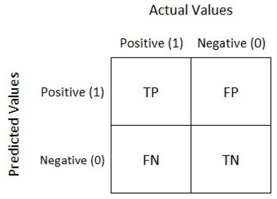 The confusion matrix [] is a performance calculation for a classification problem of learning machines that can measure the effectiveness of the proposed approach. The output can be two or more classes, as shown in Figure 14. It is a table of four different expected and true value combinations.