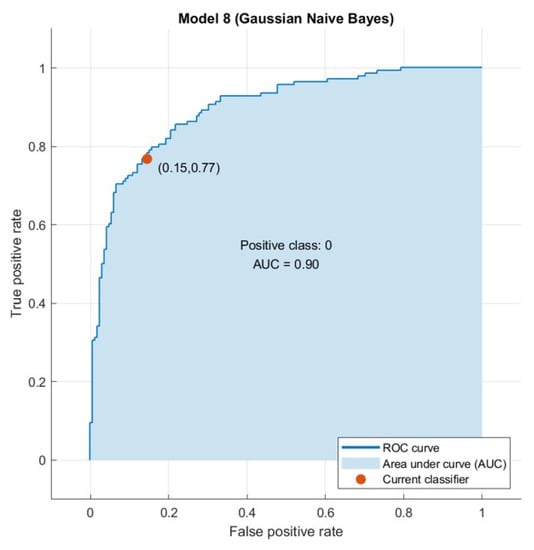 The confusion matrix is useful to calculate the Recall, Precision, Specificity, and most significantly, the Receiver Operating Characteristic (ROC) curve (simply AUC) [], and the confusion matrix is also useful for accuracy. The ROC curve is a graphical approach to demonstrate the difference between a classifier’s true-positive and false-positive rates. This allows for an approach under the ROC curve (AUC) to determine which classifier is on average better.