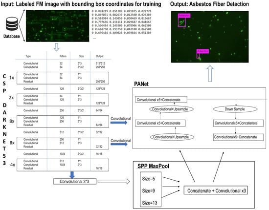 We first annotated the FM images. The annotation process was completed by utilizing Yolo_mark, which is an open-source Graphical User Interface (GUI) that allows for objects to be marked within the images. The program was compiled in Microsoft Visual Studio (MSVS) 2015 (Microsoft Corporation, Albuquerque, NM, USA) to run on Windows Operating System (OS) with OpenCV. A text file was created with a list of the names and locations of each section image (see the Input section in Figure 1). In the text file, the first number identifies the object class, which is zero (0 = asbestos). The next two columns represent the X- and Y-coordinates of the object, and the last two columns determine the height and width of the bounding box. Then, the annotated images were used for training the YOLOv4 model to detect the asbestos fibers. The model was trained three times.