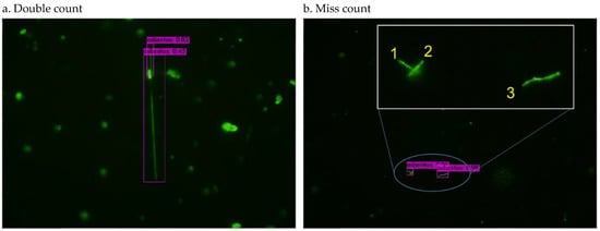 Figure 3 shows an FM image, which includes both false positive and false negative cases. The model falsely recognized an aggregated particle as an asbestos fiber (FP case) and missed a fiber that has a blurring boundary together with other particles (FN case). Figure 4a double counts a single fiber due to the overlap with a non-fiber particle, and Figure 4b counted two vertically-crossed fibers (1 and 2) as one fiber. More images for training are needed to improve the model’s capability of recognizing asbestos in uncommon situations, as shown in Figure 3 and Figure 4.