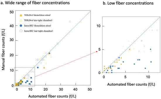 Correlation between manual and automated fiber counts at (a) the wide range of fiber concentrations (0–50 fibers/liter, f/L) and (b) low fiber concentrations (<15 f/L). The dotted area in (a) was enlarged in (b). Shaded and open triangles (brown) represent data points analyzed by YOLOv4 at threshold value of 0.7 with dust samples at demolition sites and relatively pure asbestos minerals, respectively. Shaded and open circles (blue) represent data points analyzed by Intec/HU asbestos software with dust samples at demolition sites and relatively pure asbestos minerals, respectively.