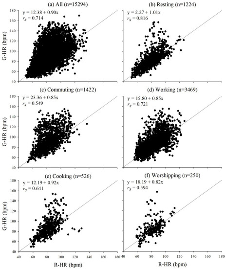 Figure 1 shows the correlations between G-HR and R-HR during various daily activities, including all activities, resting, commuting, working, cooking, worshipping, shopping, exercising, eating, bath/shower, sedentary activities, and other activities (Figure 1a–l, respectively). Overall, the correlations between G-HR and R-HR were over 0.5 during various activities. The highest correlation coefficient arose when subjects were resting (rs = 0.816). Other activities had the second highest correlation coefficient (rs = 0.797), probably because other activities were mainly included the low-intensity activities, such as waiting to see the doctor in the clinic and housekeeping. Therefore, the correlation coefficient of the other activities was similar to that of sedentary activities (rs = 0.741). The correlation between the G-HR and R-HR was relatively low when the subjects were exercising. This may be because the smartwatches were too loose during exercise, resulting in underestimation of HR. The correlation analysis indicated that the data from G-HR were generally highly correlated to those from R-HR when the subjects were engaged in their daily routines, except when they were exercising.