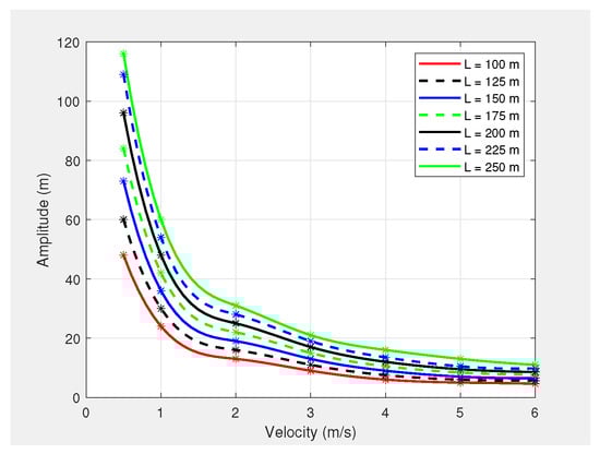 Although the amplitude of the UAV’s planned path from is independent of the UAV’s horizontal velocity, the PID controller of the PX4-autopilot limits the amplitude based on the UAV’s horizontal velocity. This is due to the inability of the PX4-autopilot to perform sharp turns at either a positive or negative peak of the sinusoidal path when the UAV is moving at a high speed in the horizontal direction. Figure 2 shows a graph of the PX4-autopilot’s supported maximum amplitude versus velocity for different wavelengths. Therefore, was reformulated to enable the generation of the appropriate waypoints for the PX4-autopilot’s offboard mode, as follows: