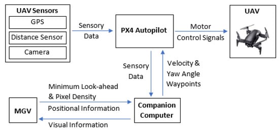 The simulation framework of the proposed ED-APF is presented in Figure 3. The path planner receives input information for the MGV’s position, minimum look-ahead distance, and required pixel density range from the MGV at a frequency of 10 Hz and the UAV’s onboard sensory data from the PX4-autopilot through the MAVLink protocol. These sensory data included the UAV’s position, velocity, yaw angle, distance to obstacles and angle between the UAV’s heading and obstacles. The MGV’s position information was used to calculate its velocity and heading. The path planner generated the UAV’s velocity waypoints for following the MGV while avoiding obstacles and extending the reconnaissance of its route ahead.