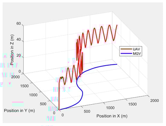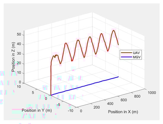 The UAV’s planned path in 3D when following the MGV while moving on a straight path.