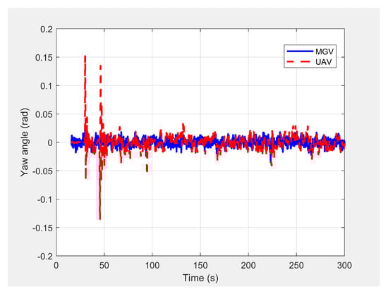 Variation in the UAV’s yaw angle when following the MGV while moving on a straight path.