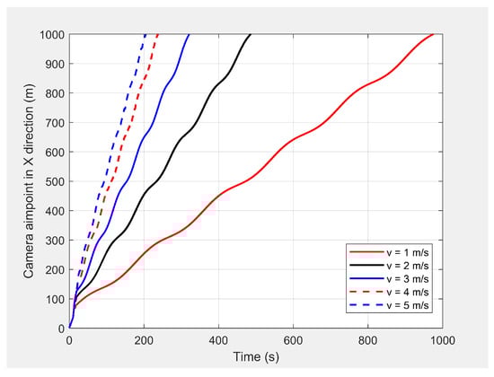 Finally, the MGV’s velocity was set at different constant velocities ranging from 1 m/s to 5 m/s for its 1000 m straight path. The MGV required and L were selected as and 175 m to achieve the sinusoidal amplitude of 10 m for all the selected velocities of the MGV and to clearly show the change of wavelength and frequency for different velocities of the MGV. Figure 9 shows the horizontal velocity of the UAV for different constant velocities for the MGV ranging from 1 m/s to 5 m/s. The UAV reached its maximum velocity in the first few minutes due to the higher relative displacement between the UAV and the MGV. The UAV then maintained a unique horizontal velocity as it followed the MGV. The ED-APF changed the frequency of the path with respect to time while maintaining a constant number of sinusoidal waves with respect to the position, as depicted in Figure 10 and Figure 11, due to the fact that the ED-APF’s vertical attractive force was a function of the UAV’s displacement. The planned path was sinusoidal along the X-axis with a wavelength of 175 m with regard to the MGV’s velocity. However, the UAV’s altitude versus time graph shows the sinusoidal path time periods of 182, 91, and 45.5 s, in line with the MGV’s velocities of 1, 2, and 4 m/s, respectively. Figure 12 shows the camera’s aim point of the UAV’s planned path while following the MGV where the average gradient was greater than 92% around the horizontal velocity of the UAV. The difference between the average gradient and the corresponding velocity decreased with the MGV’s velocity. This was because the amplitude of the sinusoidal path decreased with the MGV’s velocity due to the PX4-autopilot’s limitations.