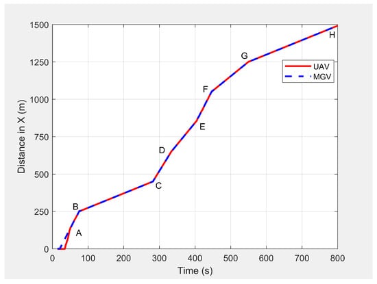 Figure 21 shows the velocity profile of the MGV and the horizontal velocity component of the UAV. The UAV had a relative velocity of 0.13 m/s and a standard deviation of 0.2 m/s at the MGV’s velocity of 3 m/s. These changed to 0.11 m/s and 0.15 m/s, respectively, at the MGV’s velocity of 1 m/s, 0.18 m/s, and 0.21 m/s, respectively, and at the MGV’s velocity of 4 m/s. Figure 22 shows how the UAV changed the amplitude and wavelength of its path based on the MGV’s velocity.