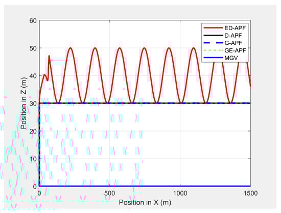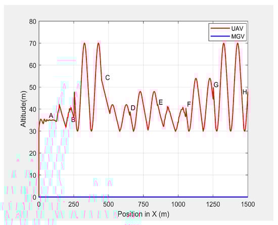 Variation in the altitude of the UAV’s planned path with the horizontal position when following the MGV in the presence of static obstacles.