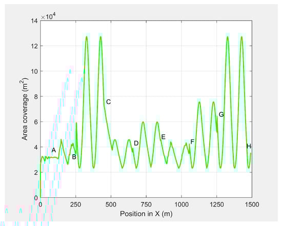 In the third set of simulation experiments, the ED-APF’s performance was evaluated as the MGV moved at a varying velocity on a straight path of 1500 m. The MGV’s requested visual quality was chosen as , which allowed the UAV to achieve a 20 m peak amplitude and to clearly show the change of amplitude and corresponding look-ahead and coverage for different velocities of the MGV. L and were set to 100 m and , respectively. Figure 13 shows the displacement versus time of the UAV following the MGV while moving along the X-direction with a varying velocity in the range of 1 to 5 m/s. The MGV started its horizontal motion at 5 m/s, and the UAV moved vertically until it reached before it started following the MGV. The UAV followed the MGV along a sinusoidal path while accelerating in the horizontal direction. The UAV flew at a horizontal distance of 140 m from the MGV and followed the MGV for 110 m at 5 m/s to reach Point B. Table 2 summarizes the motion profiles of the MGV and UAV and the look-ahead distance, coverage, and pixel density. Figure 14 shows the altitude of the UAV’s planned path versus time. It shows how the wavelength increased with the amplitude; a larger amplitude indicates a faster velocity of the UAV in the horizontal direction. However, the UAV maintained a wavelength of 100 ± 5 m in the X-direction regardless of the velocity, as shown in Figure 15. As shown in Figure 16, the maximum and minimum look-ahead coverages of 6.22 × and 1.14 × m were achieved at altitudes of 70 and 30 m, respectively.