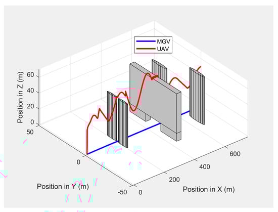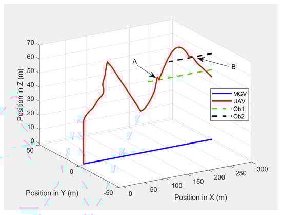 The UAV’s planned path in 3D when following the MGV in the presence of dynamic obstacles.