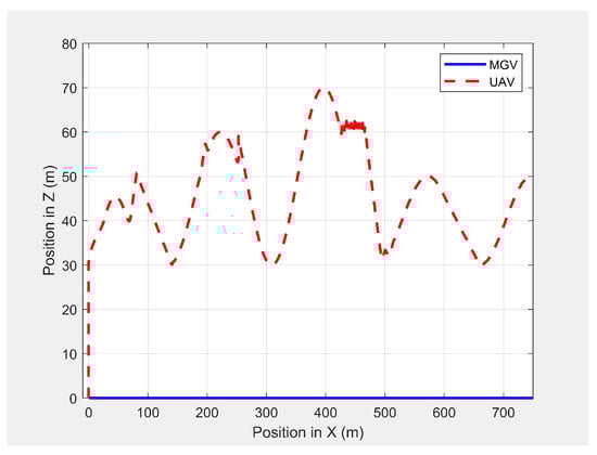 In the second experiment, the MGV moved for 1500 m along the X-direction at a speed of 3 m/s in an environment with objects acting as occlusions to the UAV’s camera along the MGV’s route. Initially, the MGV passed between two symmetric and cylindrical objects with a radius of 10 m and a height of 12 m positioned at (580360, 1520 and , which did not act as obstacles to either the UAV or the MGV. Later, the MGV moved under a bridge object, with a length of 10 m, a width of 80 m, and a height of 12 m positioned at (880, which blocked the direct line-of-sight of the UAV’s camera to the MGV’s route. Finally, the MGV moved near by a cylindrical object, with a radius of 10 m and a height of 12 m positioned at (1230,20, which partially blocked the line-of-sight of the UAV’s camera to the MGV’s route on the left-hand side.
