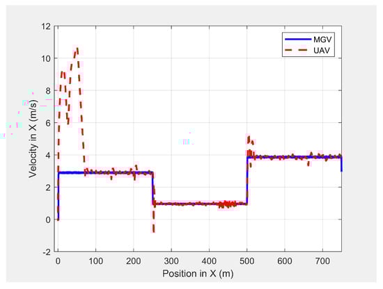 The UAV’s velocity in the horizontal direction when following the MGV while moving at varying velocities in the presence of static obstacles.