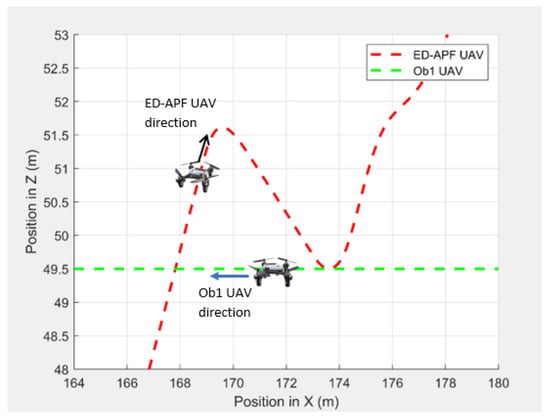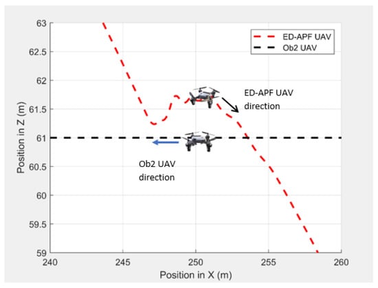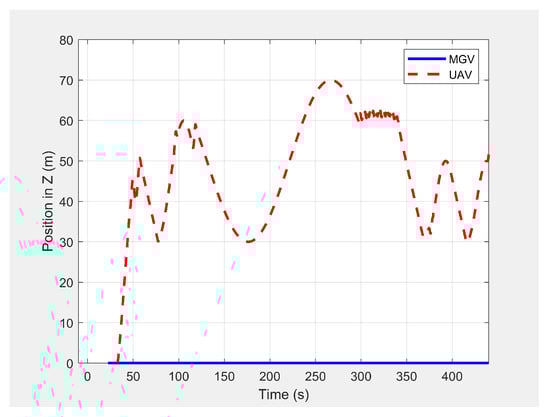 In the second scenario, two dynamic obstacles were considered: two UAVs moving at 1 m/s along the negative X-direction at altitudes of 49.5 m (Ob1) and 61 m (Ob2). The MGV moved at 2 m/s along the positive X-direction. Figure 23 shows the 3D path of the UAV following the MGV in the presence of dynamic obstacles. The UAV encountered Ob1 and Ob2 at and , respectively. The UAV successfully changed its altitude in the presence of the dynamic obstacles to avoid collision and then continued following the MGV along its sinusoidal path. Figure 24 shows the variation in the altitude of the UAV before and while encountering a dynamic obstacle. Figure 25 and Figure 26 show the variation in the altitude of the UAV in the presence of the dynamic obstacle, which was Ob2, the UAV, before they passed each other and after they passed each other. The UAV successfully changed its altitude for obstacle avoidance while following the MGV.