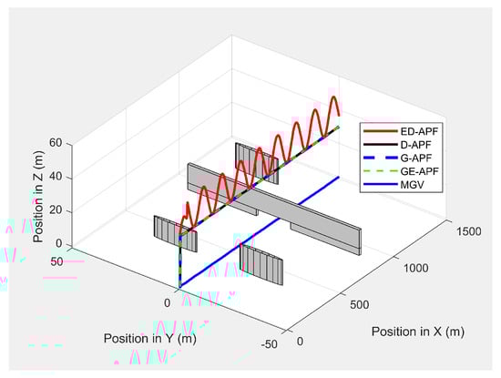 The proposed ED-APF approach was also compared against the D-APF technique and the general APF techniques in scenarios where the flying environment had objects that were not obstacles for the UAV. The ED-APF showed superiority to the D-APF and the general APF techniques in terms of improving the look-ahead distance and coverage. This was mainly achieved by the change of the UAV’s altitude in a vertical sinusoidal path, which minimized the blockage of the direct line-of-sight by the obstacles. Therefore, the ED-APF was more efficient than other existing path planning techniques for multirotor UAVs in providing reconnaissance and look-ahead support for MGVs.