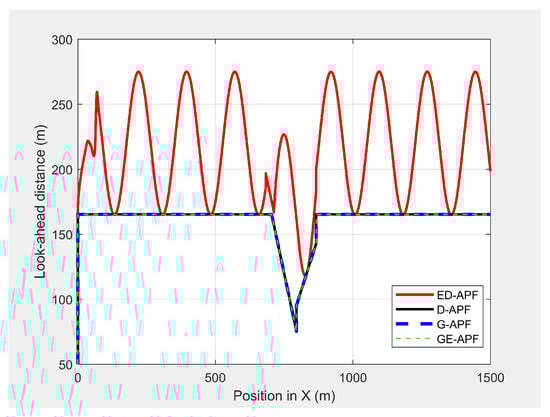 Table 1 summarizes the look-ahead distance and coverage of the ED-APF for different and the corresponding . Increasing required increasing and L, which increased the look-ahead distance and coverage, as well as the minimum look-ahead distance of the MGV’s onboard sensors. Changing from 94 m to 190 m increased the maximum look-ahead distance by 160% and the maximum look-ahead coverage by 478%. In addition, changing L from 100 m to 200 m increased the minimum look-ahead distance by 98% and the minimum look-ahead coverage by 251%. This was because, for the selected MGV’s velocity, the UAV’s amplitude increased with L; therefore, the look-ahead distance and coverage increased with L.