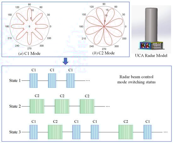 A uniform circular array radar is used for data collection. The radar system consists of a receiver, transmitter, transceiver antenna, signal processing unit, and power module. The antenna part comprises eight waveguide slot antennas with the same array element structure and adopts the operation mode of split transceiver. The UCA radar transceiver antenna is designed by eight conformal array elements with an interval of 45° along the circumferential azimuth direction, and the azimuth 360° full coverage circumferential scanning is realized by means of phase weighting. The antenna emission pattern is a multi-main-lobe pattern, and eight antennas receive signals independently. The simulation diagram of azimuth emission in two-beam control modes is presented in Figure 1. When the channels are in phase, the synthetic antenna’s emission pattern has eight main lobes, pointing to 0°, 45°, 90°, 135°, 180°, 225°, 270°, and 315° respectively (Figure 1a). When each channel is combined at a phase interval of 90°, the main lobe directions of the antenna emission pattern are 22.5°, 67.5°, 112.5°, 157.5°, 202.5°, 247.5°, 292.5°, and 337.5° respectively (Figure 1b). In addition, the pitching 3 dB beam width of a single element is 17.47°, and the pitching main beam direction of all transmitting and receiving array element is 90°. The radar system realizes the whole scene’s detection through an alternating transformation of the two beam-controlled modes. The beam control code switches to display three states during regular operation (Figure 1).