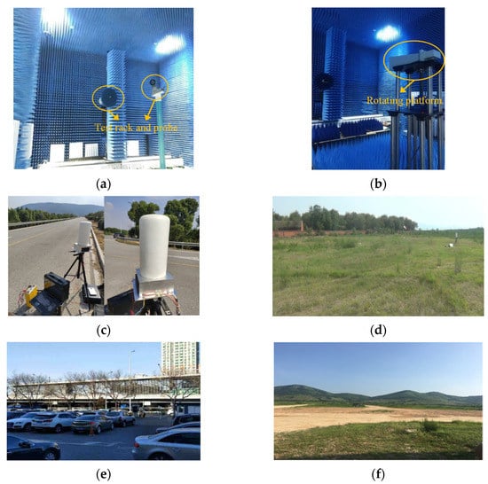 UCA radar data collection for different scenarios: (a) Microwave anechoic chamber test rack and probe; (b) Microwave anechoic chamber rotating platform; (c) Highway; (d) Dry grassland; (e) Town; (f) Gravel land.