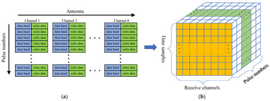 Since each antenna of the radar receives signals independently, a pulse contains eight echo data channels, and the data structure is shown in Figure 3. In the distance dimension, the received signals are discharged in accordance with the sequence of channels and the pulse data of each channel contains frame header information, which is used to mark the pulse number and the wave-controlled mode (Figure 3a). Radar parameters such as pulse repetition frequency (PRF), sampling points of range dimension, and coherent processing interval (CPI) are slightly different among the data collected in different experimental scenarios. To observe the composition and structure of radar data, the frame header information is removed in Figure 3a, and multiple radar pulse data of eight receiving channels are spliced into a data cube (Figure 3b). The longitudinal direction represents the data sampling of the slow time dimension. The UCA radar data cube’s structure model is the basis for analyzing radar data characteristics and understanding signal processing operations.