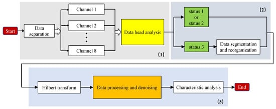 Before analyzing the characteristics of ground clutter, it is necessary to preprocess the original data collected in different scenes, including three parts (Figure 4). Data processing steps of UCA radar are listed as follows: (1) Channel data separation: By analyzing the frame header information of eight channels’ pulse-echo data, the pulse sequence and beam control modes are marked; (2) Data extraction and reorganization determine the switching state of radar beam pointing, and data collected under the same beam control mode of eight channels are grouped into the same group; and (3) Data preprocessing and analysis, including Hilbert transform, range-direction FFT, denoising, normalization processing, and data statistical analysis.