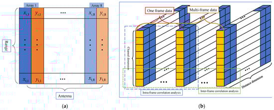 Schematic diagram of multi-dimensional data correlation analysis of UCA radar. (a) Schematic diagram of multi-channel single pulse data; (b) Schematic diagram of multi-channel and multi-pulse data.