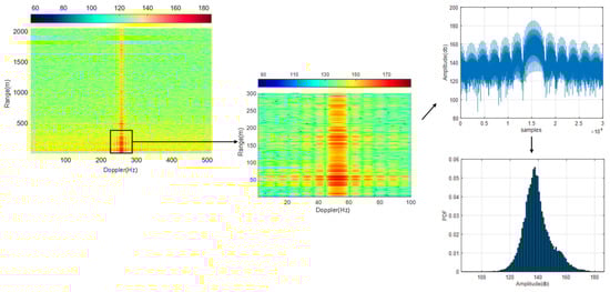 Schematic diagram of statistical parameter extraction of the range-Doppler map (Taking the dry grassland scene data as an example, 300 sample data are selected for the range unit, and 100 dimensions are chosen for the Doppler unit).