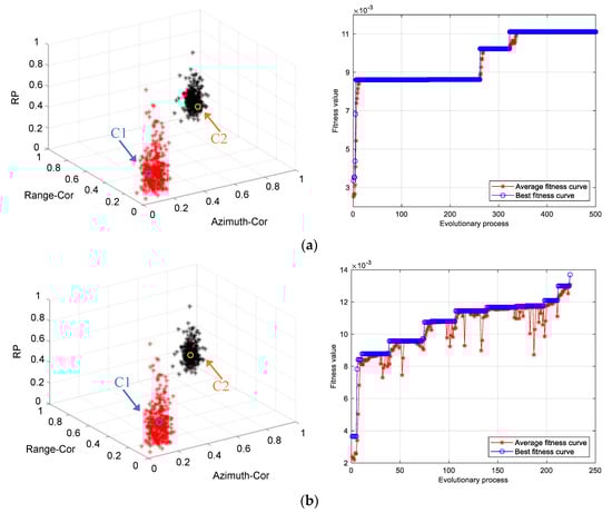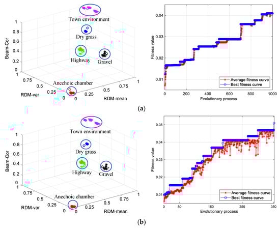 This section mainly introduces the clustering results of UCA radar clutter measured data and uses the criterion function based on Euclidean distance to evaluate GA clustering’s performance and chaotic GA clustering proposed in this paper. The feature factor is normalized according to the maximum and minimum value of the feature factor. In the scene data clustering analysis, five clustering centers are set according to different scenes of measured data. In the clustering analysis of beam control mode data, two clustering centers are set.