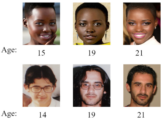 - Antipov, G.; Baccouche, M.; Berrani, S.A.; Dugelay, J.L. Apparent age estimation from face images combining general and children-specialized deep-learning models. In Proceedings of the IEEE Conference on Computer Vision and Pattern Recognition Workshops, Las Vegas, NV, USA, 26 June–1 July 2016; pp. 96–104. [Google Scholar]