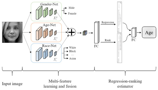 For the feature map fusion, we aimed to obtain an enhanced feature that was beneficial to the age-feature estimator. Specifically, let be the gender, age, and race feature maps, respectively, and ⊕ denote the channel-connection operation; is formed and input into the regression-ranking-age estimator to predict the final age. In other words, we first broke down the complex task of age estimation into three simple subtasks. Then we separately learned the gender-specific, race-specific, and age-specific features. After that, we fused these complementary features to form the more discriminative and robust age features. Finally, we fed the fusion features into the age-feature estimator to predict the final age.