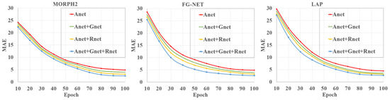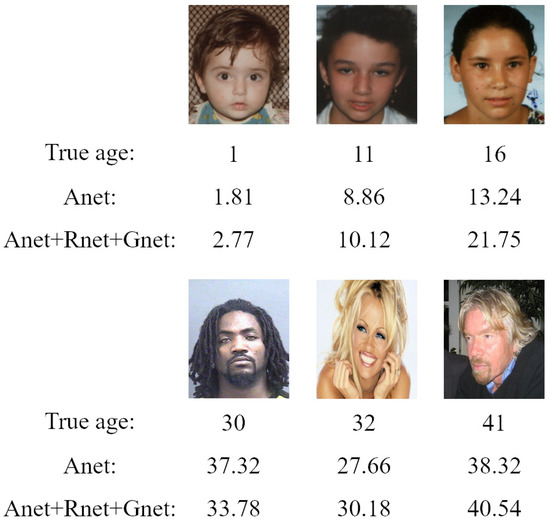 To further explore the role of Gnet and Rnet, we conducted experiments on different age groups. Figure 7 presents the prediction results of some samples of different age groups. We can see that the performance of Anet and Anet+Rnet+Gnet was similar when predicting the age of minors. The performance of Anet+Rnet+Gnet was better than single Anet at predicting the age of adults. This was because people of different genders or races have some differences in their aging patterns, and our proposed model could better utilize gender features, which could make the model more flexibility at predicting the age of people of different genders or races. For example, women do not have beards when they are minors or adults, and most men grow a beard in adulthood. Therefore, beards could be used to predict the age of men, but not women.