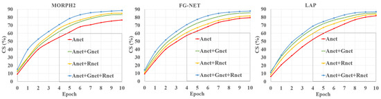 Figure 5 shows the MAEs of the proposed methods with different combinations of subnetworks. CS is presented to show the performance of different combinations of subnetworks in Figure 6. It clearly shows that Anet+Gnet and Anet+Rnet consistently outperformed the baseline Anet, demonstrating the effectiveness of both the gender- and race-feature-learning procedures. Moreover, Anet+Gnet+Rnet (i.e., the proposed method) yielded the best result. This was because age estimation was significantly affected by race and gender according to the above analysis. For different targets (race, gender, and age), we used different subnetworks to extract different kinds of features and form more robust and discriminative features. This process improved the performance of age estimation and made our proposed method have lower MAEs and higher CS than the single-feature-based learning module. Therefore, the multifeature learning network could exploit more discriminative and robust age features than a single learning module for age estimation.