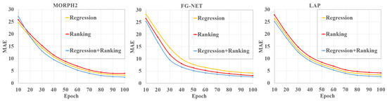To validate the effectiveness of our regression-ranking-age estimator, we compared the regression estimator, ranking estimator, and regression-ranking estimator on the age estimation task, respectively. Specifically, for the regression estimator, we removed the ranking estimator and preserved only the regression-age estimator. In contrast, for the ranking estimator, we removed the regression estimator and preserved only the ranking-age estimator.