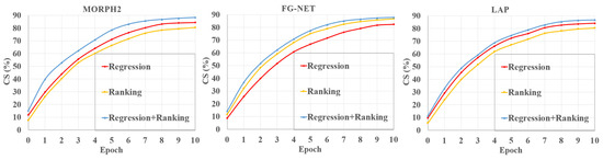 Figure 8 depicts the MAEs of the three different estimators on the three databases. CS is also presented to show the performance of different age estimators in Figure 9. We can see that our fusion estimator outperformed both the regression-only or ranking-only estimators. This was because our method benefited from not only continuous attributes of age, but also the additional ranking constraints. In addition, our proposed regression-ranking-fusion estimator could make a good tradeoff between the continuity and ordinal relationship of age for the age-feature estimator.