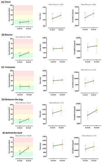 Means Means differences in passing factors (columns: accuracy, time and variability) for each type of pass (rows: (A) Chest, (B) Bounce, (C) Crossover, (D) Between-the-legs, (E) Behind-the-back.
