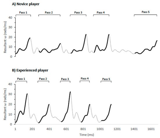 These findings are consistent with previous studies showing that more experienced players execute faster passes which lead to a better performance [48]. Skill-specific training appears to be a learning facilitator that may reduce the movement time and increase the consistency of the technical action [24]. As an example, Figure 6 depicts the sequence of five between-the-leg passes performed by one A-level player and one B-level player. It can be seen that the experienced player achieved a greater resultant angular velocity and shorter movement time in each pass, completing the sequence in a shorter time. This greater efficiency will allow the ball reaching the target faster which makes difficult the defence anticipation and increase the success ratio [49]. The fact that more experienced players showed this better ability when passing after dribbling could be explained by the need of performing previous technical actions to overcome the defence and give an accurate and intense pass to avoid the defensive reaction and let the teammate receive under optimal conditions [3].