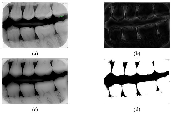 (a) The bitewing film; (b) the filtered result of (a) using the Gaussian high-pass filter; (c) the result of (a) minus (b); (d) the result of (c) after the binarization.