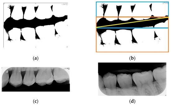 (a) The binarized bitewing film; (b) the schematic diagram of slicing the bitewing film, where the yellow line is the separating line, the blue bounding box is the area of the photo of the upper row of teeth in the bitewing film, and the orange bounding box is the area of the photo of the lower row of teeth in the bitewing film; (c,d) photos of the upper and lower rows of teeth after slicing, respectively.
