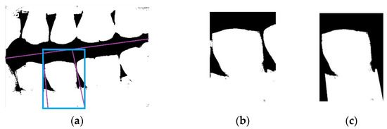 Figure 5a illustrates an example of a single tooth misjudged by the CNN model. The three purple lines are the separating lines found by horizontal and vertical projection. To completely isolate the image of the tooth within the three separating lines, the area within the blue bounding box must be selected as the slicing range. However, in the blue box, only the images framed by the three separating lines are considered. Including the outer parts of the image, i.e., outside and beyond the bounding purple lines, can cause errors in the judgment of the CNN model. Therefore, images similar to this must be masked to avoid misjudgments by the model, by setting the pixel values of the rest of the image to zero.