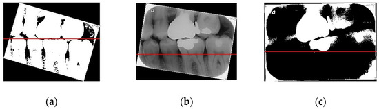(a) Image processed through the Gaussian filter and Otsu’s thresholding, where the red line separates the upper and lower teeth; (b) image without any processing, where the red line separating the upper and lower teeth is very imprecise; (c) image processed only through Otsu’s thresholding, where the red line separating the upper and lower teeth is also imprecise.