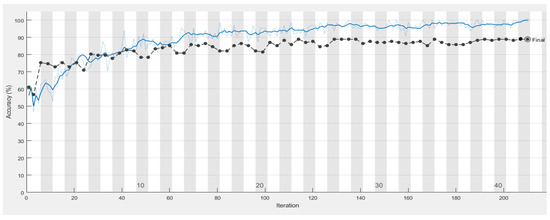 Training process of the model in classifying restorations, with the black and blue lines illustrating the accuracy of the test set and training set, respectively.