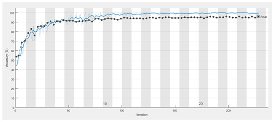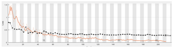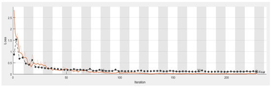 It is shown from Figure 11, Figure 12, Figure 13 and Figure 14 that a smaller loss function led to higher accuracy of the reflection. As described in Section 2.4.1. GoogleNet, Vgg19, and ResNet50 were used in transfer learning for comparison with AlexNet with the same parameters, thus allowing a comparison of the accuracy and duration.