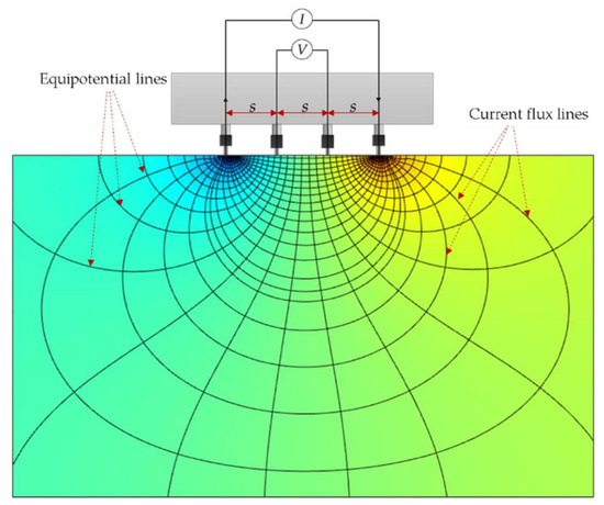 Specifically, a functional relationship between the apparent resistivity of concrete and its shape/geometrical composition should always be considered [46,47,48]. In principle, electrical resistivity () is the quotient of the potential difference over the applied electric current, multiplied by a geometric constant. In a Wenner probe configuration, four electrodes are aligned in a linear manner at an equal distance, s, to each other as illustrated in Figure 1. The external current (AC current), I, is imposed at the two exterior electrodes and the electrical potential difference, V, is measured through two internal electrodes [49]. Using the Wenner probe method, the measurement of the concrete resistivity is assumed to be on a semi-infinite, isotropic, and homogenous medium [50,51]. Mathematically, the apparent resistivity () of concrete can be expressed as Equation (1). Considering this equation, the ER measurement does not include the parameters of thickness and the surface area of the concrete specimen [46]. For example, for relatively small specimens such as beams and cylinders, constriction in the flow of the current results in an overestimation of the ER measurements. Spragg et al. (2013) [41] suggested a correction coefficient to account for the interference caused by the geometrical constraints of small concrete samples which was based on the numerical simulation conducted by Morris et al. (1996) [52]. It is defined that the true resistivity () is equal to the ratio of the apparent resistivity (ER value shown on display screens of commercial Wenner probe devices) and the geometrical correction factor, K (see Equation (2)).