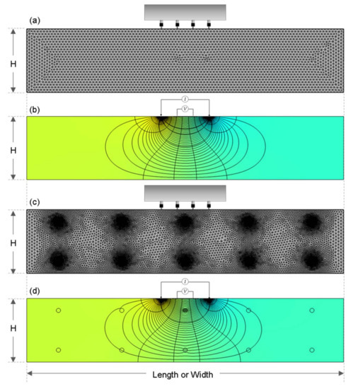 2D cross-section of finite element models for simulation of electrical field in concrete: (a,c) represents a finite element model for a plain and a reinforced concrete slab, respectively; (b,d) for the electric potential field in a plain and a reinforced concrete slab, respectively.