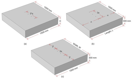 Figure 3a–c show the three different numerical simulation models of plain concrete slabs with various slab thicknesses and locations of electrode probes relative to the edge of concrete slabs. Figure 3a represents the simulation case 1 where the variable in consideration is the slab height, H. The simulation cases 2 and 3 are shown in Figure 3b,c illustrating the simulation of varying length and width, respectively.