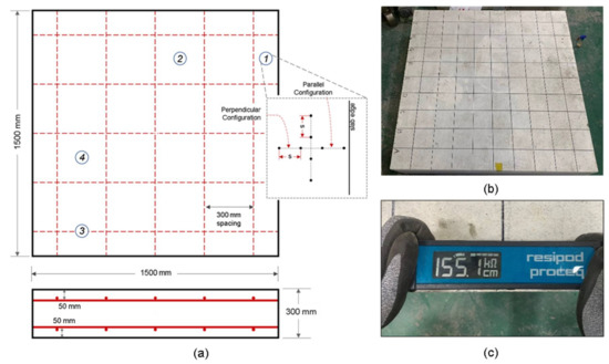 Experimental set-up of ER measurement in concrete slab: (a) schematic diagram of concrete slabs with measurement points; (b) picture of actual specimen; and (c) Wenner probe device orientation during ER measurements.