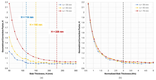 Variation of geometrical correction factor, K, obtained from the numerical simulation case 1 for the plain concrete slab model with respect to: (a) slab thickness, H, and (b) normalized slab thickness (H/s).