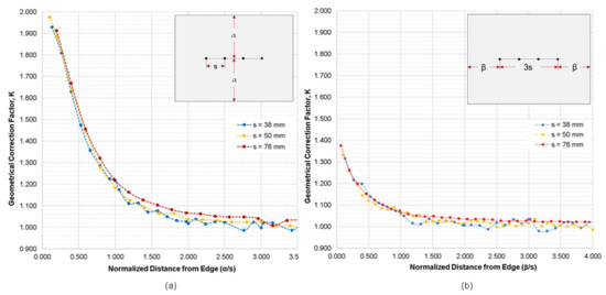 Variation of geometrical correction factor, K, obtained from the numerical simulation cases 2 and 3, with respect to the normalized distance from slab edge where (a) probes are parallel to the edge of slab, and (b) probes are perpendicular to the slab edge.